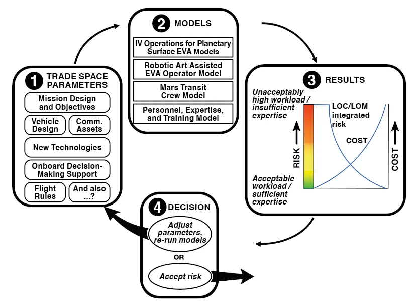 The NESC’s methodology fills a longstanding gap, as past Mars crew size determinations often lacked detailed quantitative analysis of crew tasking, workload, and expertise. Extending DoD methodologies for manpower determination, the NESC human factors trade space methodology offers a repeatable and data-driven means to assess whether a given crew complement possesses the capability to accomplish mission objectives and respond successfully to unforeseen failures that have potential loss of crew or loss of mission (LOC/LOM) consequences. The core process involves gathering Mars mission concepts and information, determining use cases to model, creating a trade space evaluation framework, conducting human performance modeling, and performing trade space analyses. This iterative approach, conceptually represented by the Mars Crew Size Decision Process (see Figure 2), allows for adaptation as technologies and mission assumptions evolve.