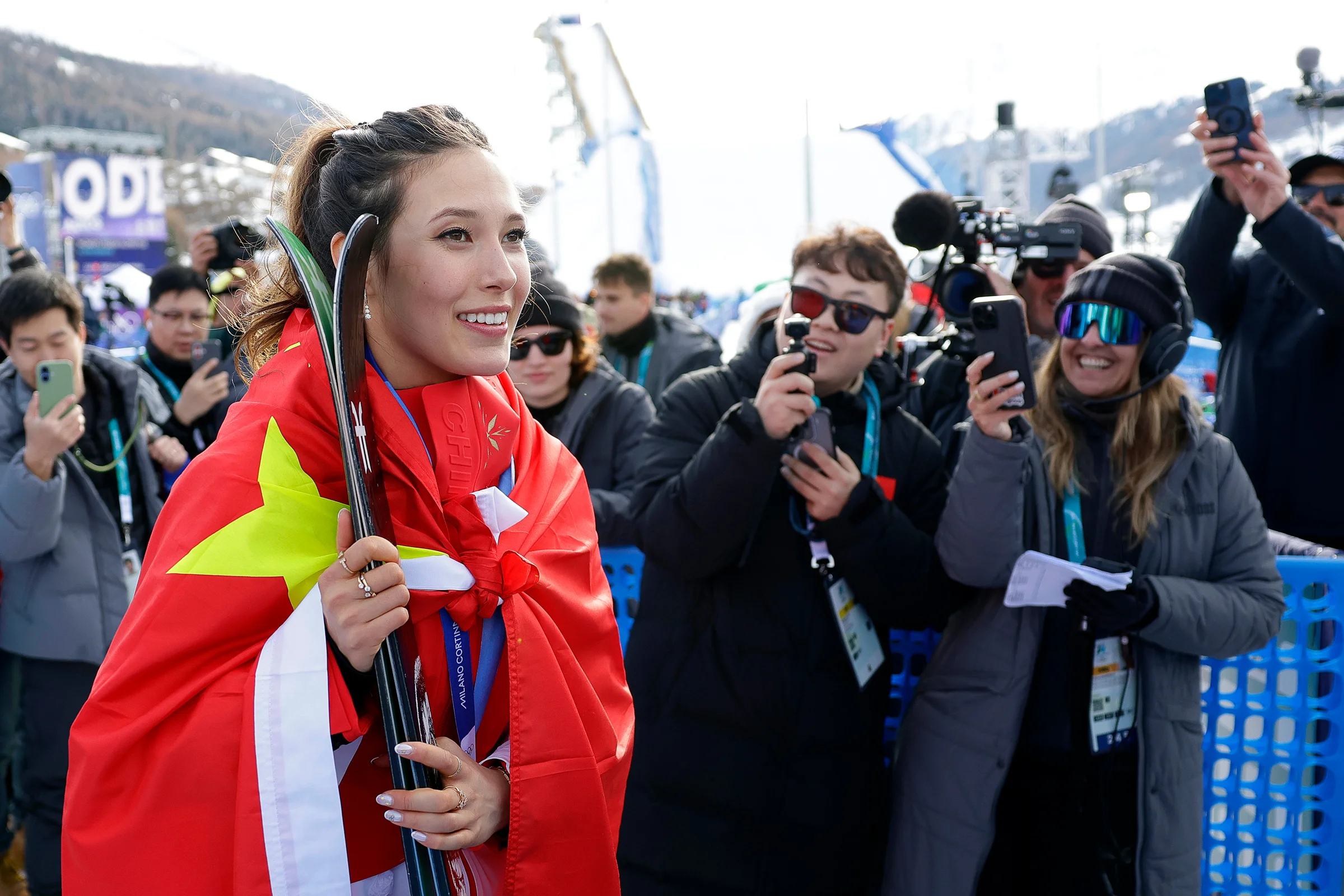 Gu betrayed no hint of disappointment after slopestyle, even fielding a question that many athletes have been receiving—about their thoughts on U.S. immigration policies, high-profile incidents involving ICE agents, and President Trump criticizing American Olympians who feel conflicted representing their country in this moment—in an upbeat manner. Gu has experience with these sorts of inquiries unrelated to her athletic endeavors: her decision to represent China, instead of the U.S., has been the subject of intense blowback for her.